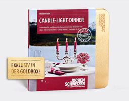 Brennende Kerzen, leuchtende Augen und ein angenehmes Kribbeln im Bauch bei dieser koestlichen Liebeserklaerung ist Ihr Partner mit Sicherheit Feuer und Flamme! Die Erlebnis-Box 'Candle-Light-Dinner': In der edlen Goldbox fuer glaenzende Auftritte. Mit detailliertem Restaurant-Katalog zum Stoebern, Entdecken und Informieren. Freie Wahl aus einem von ueber 100 Restaurants Restaurants in Deutschland und Oesterreich. Ist das perfekte Geschenk fuer alle Verliebten. Enthaelt 1 Gutschein fuer ein sinnliches 3-Gaenge-Menue zu zweit in romantischem Ambiente, inklusive Aperitif. Der Gutschein in der Erlebnis-Box ist 3 Jahre ab Ende des Kaufjahres gueltig. Sie wissen was Sie wollen: Fuer Entschlussfreudige gibt es die Candle-Light-Dinner-Auswahl auch als praktischen Gutschein mit Preisvorteil. An mehr als 100 Veranstaltungsorten in Deutschland und Österreich.