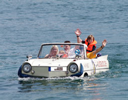 Stadt, Land, Fluss macht im Amphicar besonders viel Spass. Denn das Schwimmauto laesst sich nicht einmal von Fluessen und Seen bremsen. Ein erfahrener Amphicar-Kapitaen nimmt Sie mit auf eine unvergessliche Fahrt ins Blaue. Auf dieser spannenden Reise ueberlaesst der Kapitaen den Passagieren gerne mal das Steuer- oder Lenkrad. Auf dem Rhein benoetigen Sie die eleganten Heckflossen zum Steuern uebrigens nicht, gelenkt wird wie gewohnt mit den Vorderraedern. Einzig gewoehnungsbeduerftig ist, dass die Bremsen im Wasser nicht funktionieren. Steigen Sie ins Amphicar und nehmen Sie den Begriff Wasserstrasse ruhig woertlich!DE,Nordrhein-Westfalen,Köln,50859;