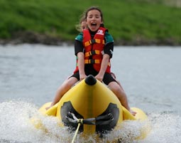 Eine lebensgrosse Banane, die mit bis zu zwoelf Personen an Bord in Spitzengeschwindigkeit uebers Wasser rast. Das klingt verrueckt? Nein, das klingt nach einer gehoerigen Portion Spass! In der Region Limburg haben Sie die Moeglichkeit mit dem Bananenboot ueber das Wasser zu fegen. Mit einer Schnur ist die fahrbare Banane an einem Motorboot befestigt und erreicht so Geschwindigkeiten von bis zu 60 Sachen. Das aufgeblasene Gummiboot in Form einer Banane wird dabei um die Kurven geschleudert. Nur wer die Sache fest im Griff hat, kann dem kalten Nass entgehen. Lassen Sie nicht locker und werden Sie zum Bananen-Rodeo-Reiter.NL,Limburg,Roermond,6041 TR;